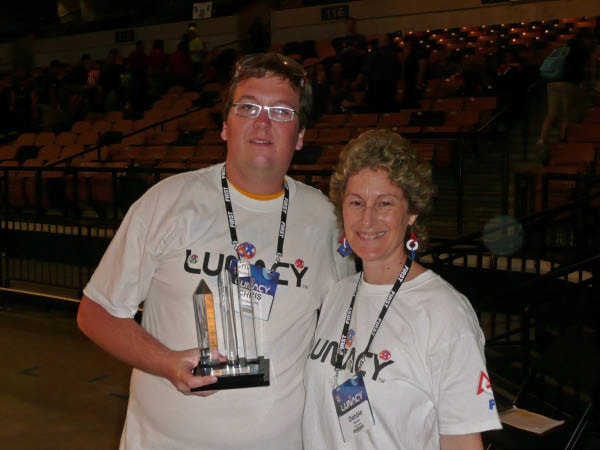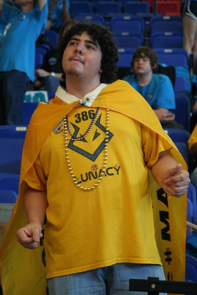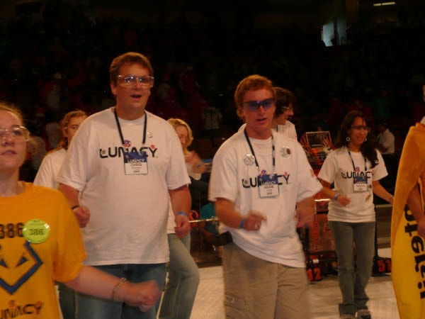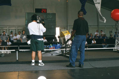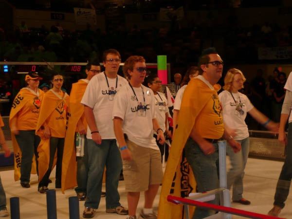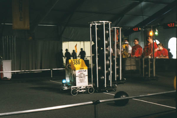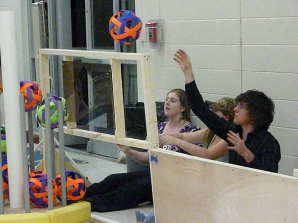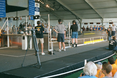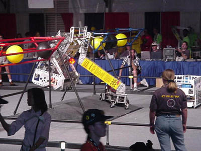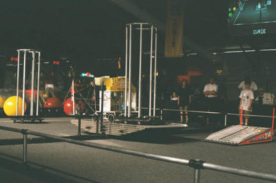 LUNACY is played on a 54' x 27' low friction field. Robots are equipped with slippery wheels and payload trailers. LUNACY game pieces are "Orbit Balls" designated as Moon Rocks, Empty Cells, or super Cells. Two three-team robot alliances collect and score Orbit Balls in trailers attached to the opposing teams' robots. Human players are positioned around the perimeter of the arena and can score from their stations.