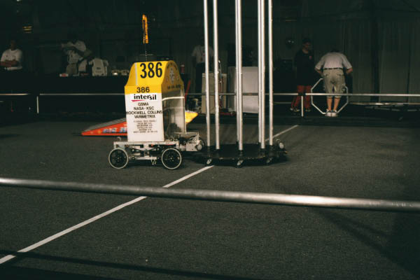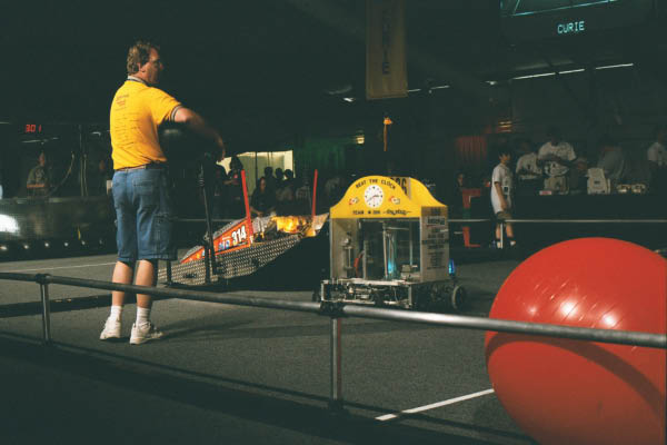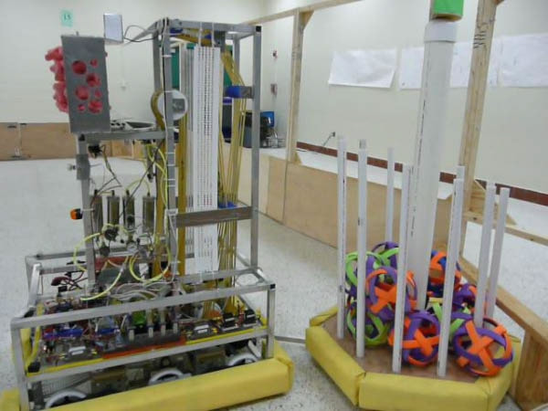 The playing field was a carpeted, rectangular area with two 6 ft (2 m) high goals located midfield, one goal for each alliance. There is a 30 in (762 mm) clearance bar under each goal. Between the goals is an 8 ft (2 m) wide ramp with a 5 ft (2 m) clearance bar, which robots may hang on to score points. Around the perimeter of the field are four stations for human players, who work with remote controlled robots on the field to score points. At the start of each match, each alliance station contains seven yellow balls and one black ball. Fifteen yellow balls and two black balls are located at the far end of the playing field.