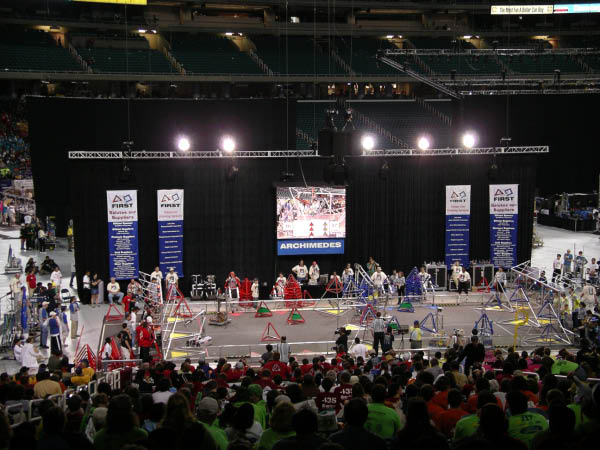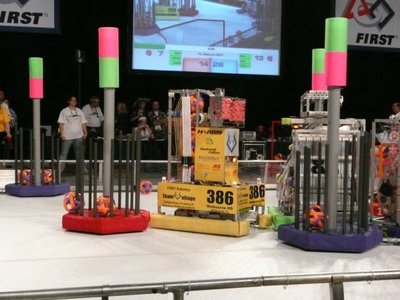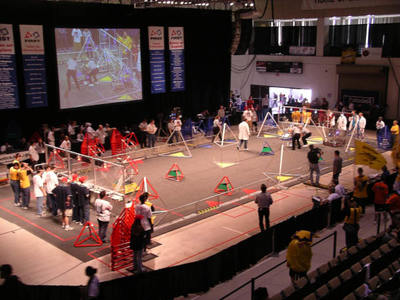 LOGO MOTION⢠is played by two competing alliances on a flat 27' x 54' foot field. Each alliance consists of three robots. They compete to hang as many inflated plastic shapes (triangles, circles, and squares) on their grids as they can during a 2 minute and 15 second match. The higher the teams hang their game pieces on their scoring grid, the more points their alliance receives.