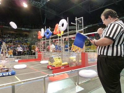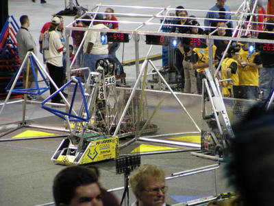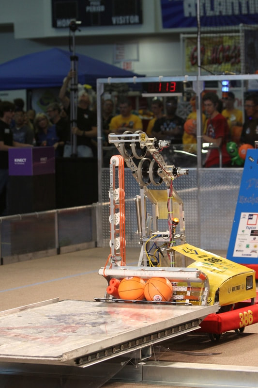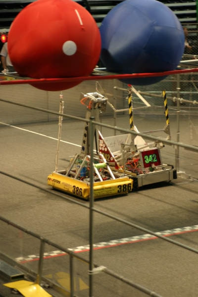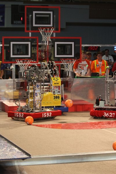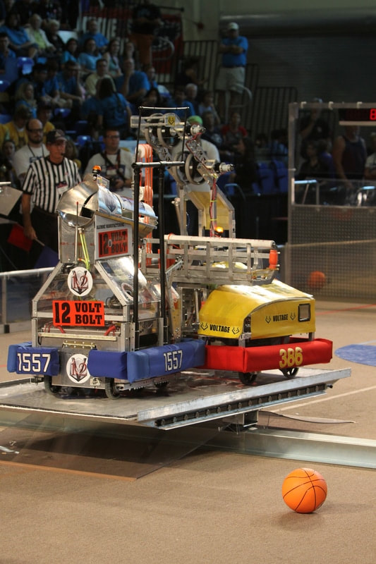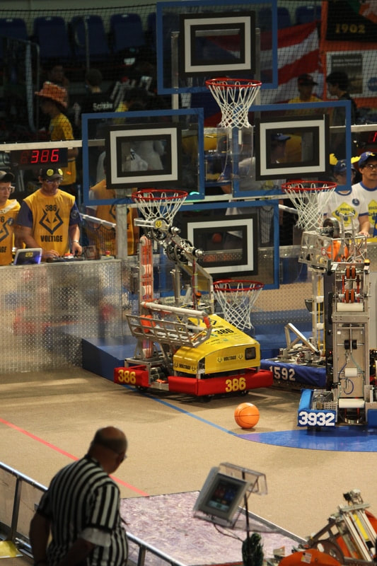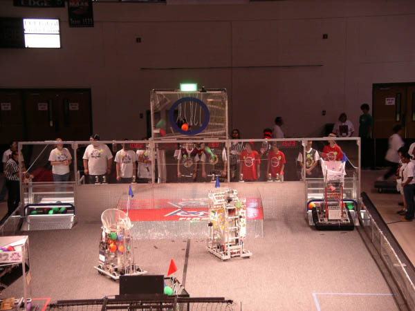 The Rebound Rumbleâ Â Â robotics game is played between two Alliances of three teams each. Each Alliance competes by trying to score as many of the basketballs in the hoops as possible during the 2-minute and 15-second match. Balls scored in higher hoops score Alliances more points. Alliances are awarded bonus points if they are balanced on bridges at the end of the match. In matches where opponent Alliances work together to balance on the white bridge, all participating teams earn additional valuable seeding points.