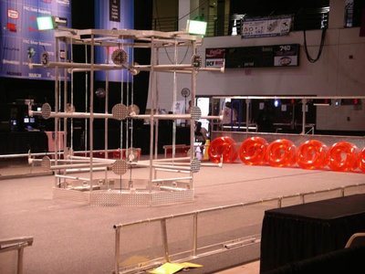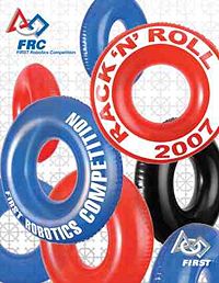 Rack 'n' Roll is a game played on a field as illustrated in the figure below. Two ALLIANCES, one red and one blue, composed of three teams each, compete in each match. The object of the game is to attain a higher score than your opponent ALLIANCE by placing toroidal GAME PIECES (i.e. swimming pool inner tubes) on the central goal structure (the RACK), and/or by having ROBOTS in their HOME ZONE and not in contact with the playing field at the end of the match. Details on the game can be found in the game manual.