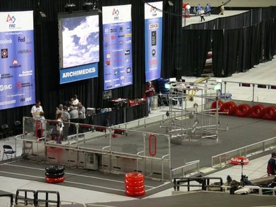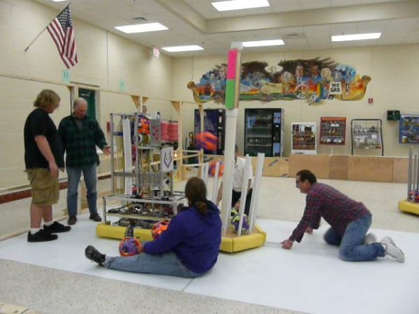 The playing field is a carpeted, rectangular area. Dividing the field in half is an 18 in (457 mm) high railing with a central bridge, which can tilt to either side of the field or remain level. Two 7 ft (2 m) high movable goals begin on opposite sides of the field. Around the perimeter of the field are two stations for human players, who work with remote controlled robots on the field to score points. At the start of each match, the alliance station contains twenty small balls. An additional twenty small balls and four large balls are located at the far end of the playing field.